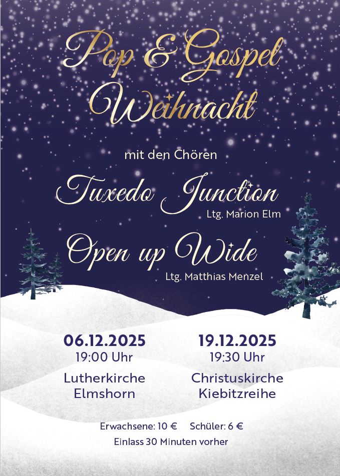 Sa, 06.12.25 19:00 Uhr Weihnachtskonzert in der Lutherkirche in Elmshorn mit dem Gospelchor Open Up Wide, wir freuen uns schon ;-)